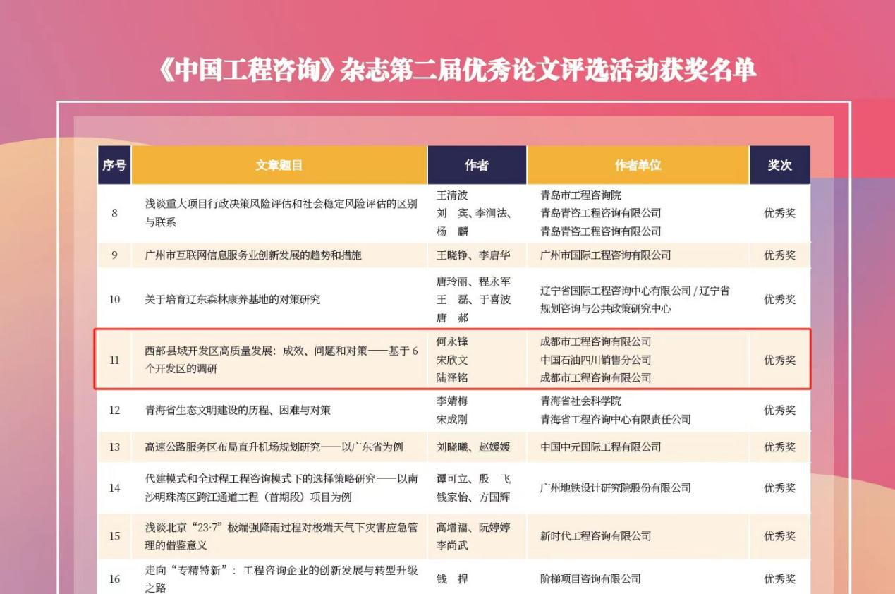 為激勵(lì)廣大咨詢行業(yè)從業(yè)者積極參與學(xué)術(shù)研究與創(chuàng)新,促進(jìn)高質(zhì)量學(xué)術(shù)成果的廣泛交流與傳播,《中國(guó)工程咨詢》雜志社開(kāi)展了第二屆優(yōu)秀論文評(píng)選活動(dòng)。評(píng)選范圍覆蓋2024年度發(fā)表在《中國(guó)工程咨詢》雜志上的共計(jì)193篇文章,經(jīng)過(guò)網(wǎng)絡(luò)評(píng)選以及專(zhuān)家委員會(huì)評(píng)審等嚴(yán)格的評(píng)比程序,公司撰寫(xiě)的《西部縣域開(kāi)發(fā)區(qū)高質(zhì)量發(fā)展:成效、問(wèn)題與對(duì)策》一文榮獲優(yōu)秀論文獎(jiǎng)。